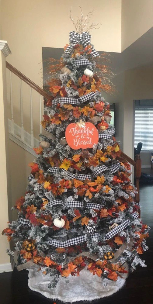 Fall Tree / Autumn Tree - with leaves, a scarecrow, black and white tartan ribbon and pumpkins. This tree represents everything autumn/fall. Finished off with a Thankful and Blessed sign. We love this tree.