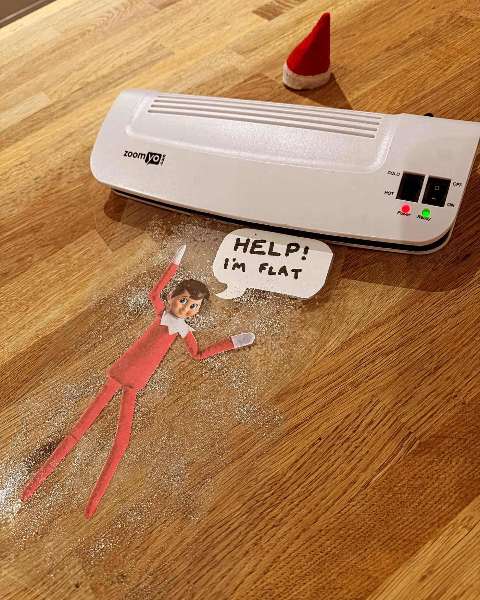 Create a melted snowman but using milk, Maltesers as eyes, a carrot nose, and cookies as buttons. Add a hat to the top. Carefully place the hair dryer above as if the elf has melted him.